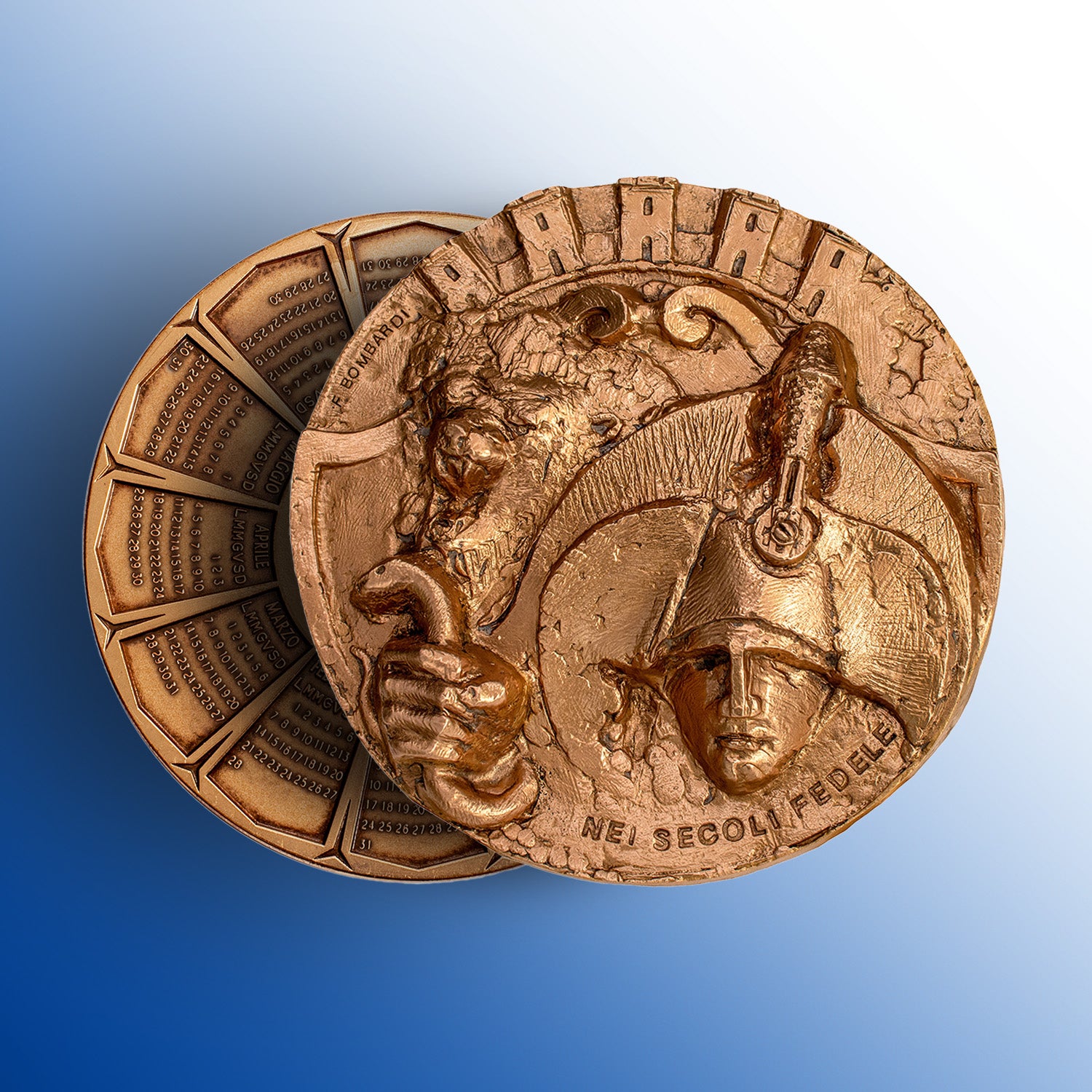 La medaglia ha un diametro di mm.70 ed è coniata in bronzo patinato e sfumato a mano.